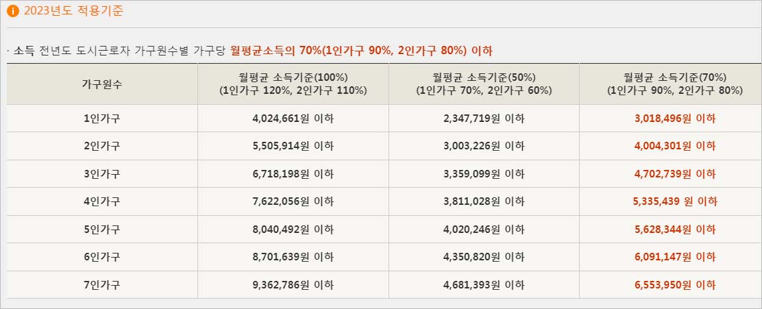 위 이미지에서 가구수별 중위소득 70% 금액을 확인해 볼 수 있습니다.